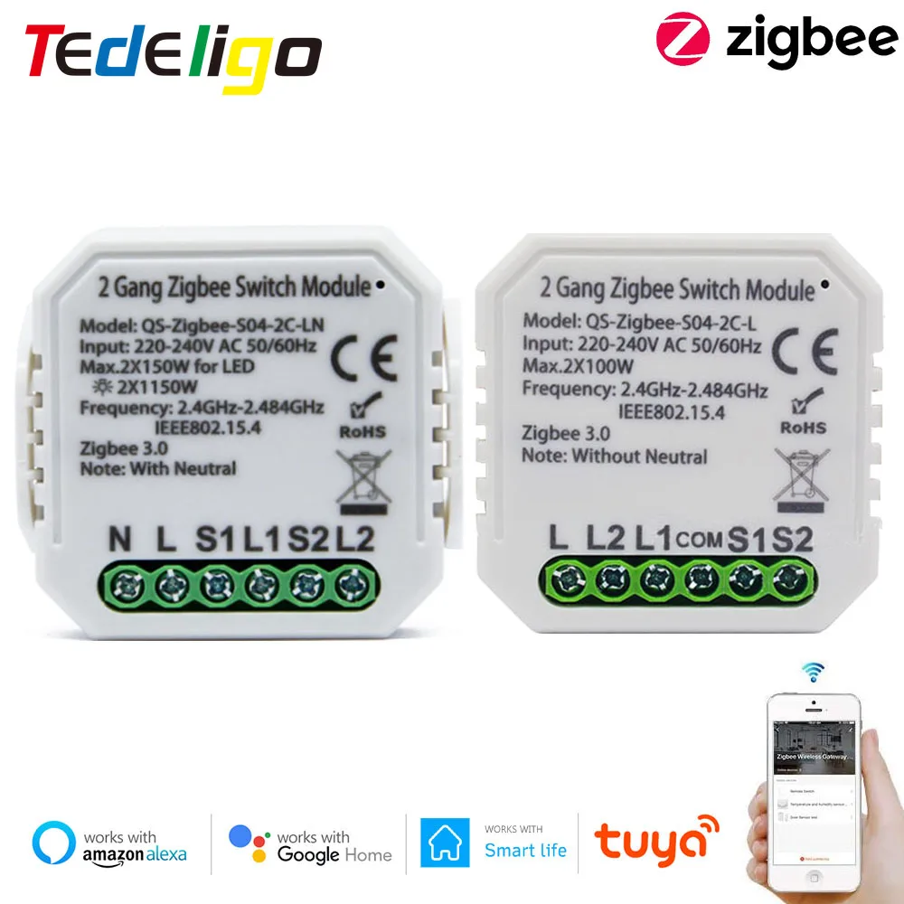 Zigbee Tuya Light Switch 2Gang No/With Neutral Smart Life Module AC220V Voice Wireless Remote Control Work With Alexa GoogleHome