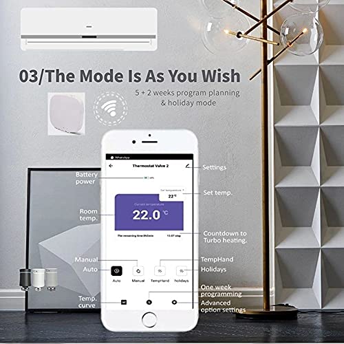 【Multifunzione】Questa valvola termostato supporta la calibrazione della temperatura, protezione ad alta e bassa temperatura, funzione di ripristino, ecc.6 modalità di funzionamento: modalità manuale, modalità automatica, modalità vacanza, modalità comfort, modalità ECO e modalità BOOST. In modalità automatica, è possibile scegliere il tipo di programma 5+2, 6+1 o 7 giorni e impostare fino a 6 periodi di tempo e 6 temperature al giorno. Ciclo settimanale.