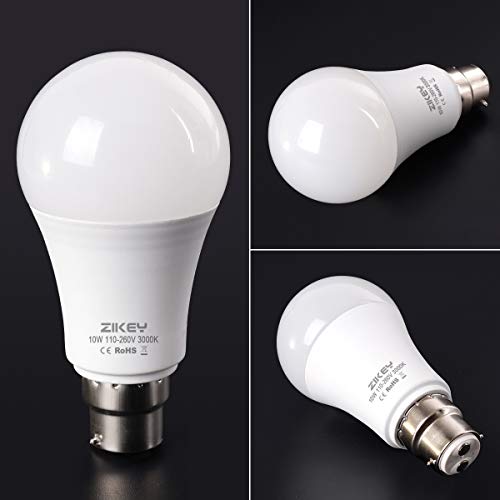 ZIKEY Lampadine a LED a baionetta B22, 10 W (equivalenti a 70 W), lampadine a globo A60, 3000 K, luce bianca calda, 900 lumen, non dimmerabili, confezione da 6