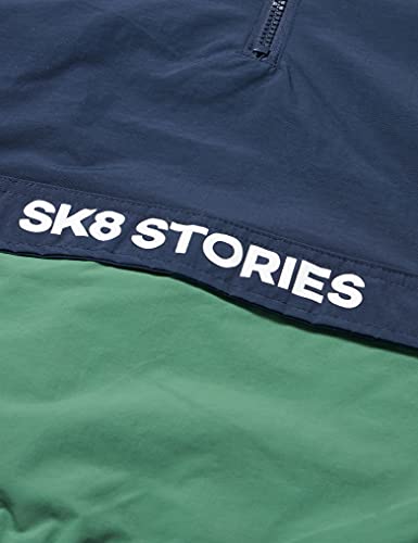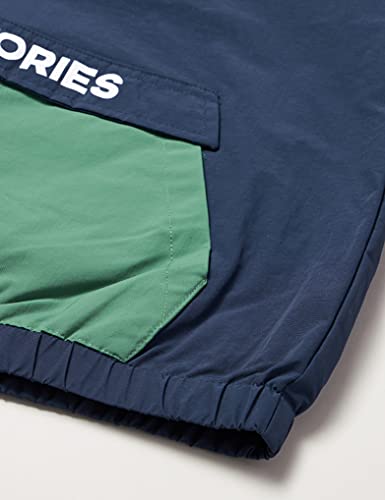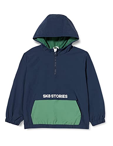 Giacca a vento blu scuro con cappuccio e fodera in mesh a contrasto. Chiusura lampo sulla parte superiore. Tasca a marsupio a contrasto e patta decorativa con stampa. Polsini e orlo elasticizzati per una migliore vestibilità. Etichetta all'interno per l'identificazione del bambino.