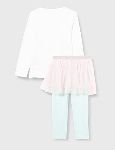 Pigiama da bambina in cotone. Maglia a maniche lunghe bianca con stampa frontale, dettagli glitterati e pizzo sul collo. Pantaloni verde chiaro con applicazione di gonna in tulle rosa e vita elastica brillante. Etichetta interna stampata per non irritare la pelle. Tessuto con finitura extra morbida.