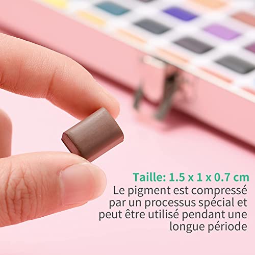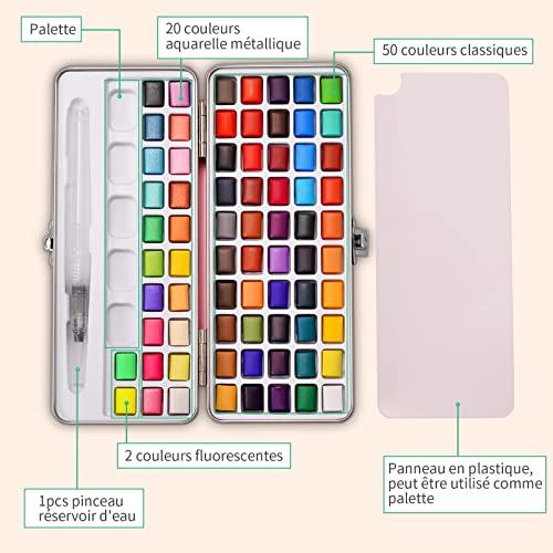 【72 Colori per Pittura ad Acquerello】: 20 colori acquerello brillanti e 50 colori classici e 2 colori fluorescenti. Inoltre ci sono pennelli per serbatoio dell'acqua.