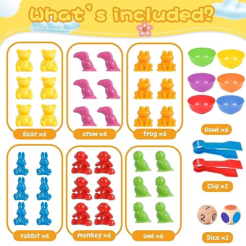 GRANDE VALORE:Animali Fattoria Per Bambini, Il gioco di smistamento degli animali della fattoria da 47 pezzi include 36 simpatici animali in 6 colori vivaci, 2 pinze giganti, 6 tazze di smistamento colorate, 2 cubi, 1 secchio per riporre gli oggetti, creando un'esperienza divertente per i più piccoli. È il giocattolo perfetto per imparare i colori e l'ordinamento è anche un gioco di memoria.