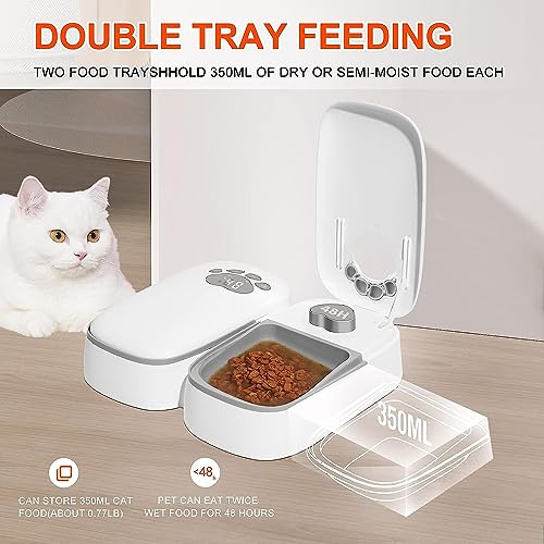 Doppio vassoio di alimentazione: ZMAYPLUS Pet Feeder ha due vassoi per alimenti da 350 ml, che possono contenere alimenti secchi o semi-umidi, adatti per l'alimentazione di pasti per gatti, cani di piccola taglia e alimentazione di snack per cani di taglia media o grande. Suggerimenti: per evitare l'apertura del coperchio, non posizionare cibo o muco sul bordo del vassoio.