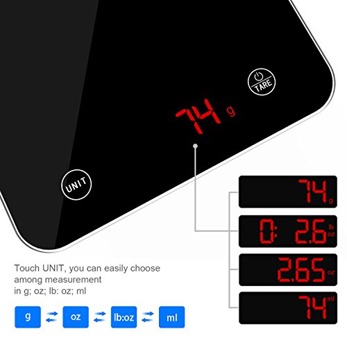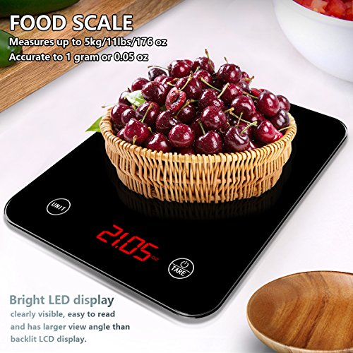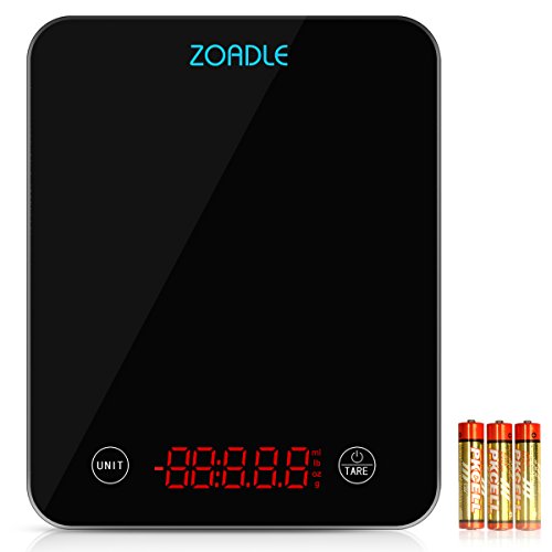 Zoadle, bilancia digitale da cucina, con display a LED luminoso, in vetro temperato, facile da pulire, misurazione di precisione fino a 5 kg, batterie incluse 20*16*2 CM Nero
