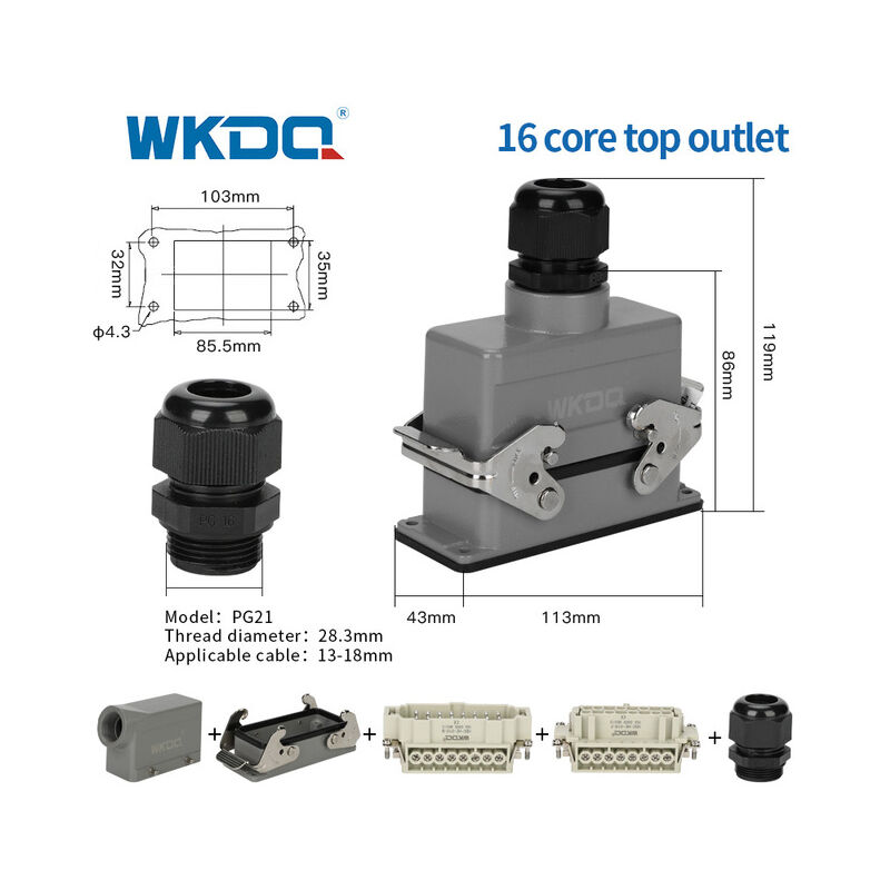 Heavy Duty Connettore HDC-HE-16 Core Industriale Spina Aviazione Impermeabile Presa 16A 500V Top Linea E Linea Laterale DESCRIZIONE Connettori di Alimentazione Heavy Duty sono ideali per applicazioni industriali con requisiti difficili. E 'in grado di contribuire a fornire una soluzione per la vasta gamma di esigenze in connettori industriali in meccanica e impianto di ingegneria. Di lavoro insieme con cavo di ingresso connettore, comodo da utilizzare per fornire un facile da usare e di salvaguardia per i macchinari attrezzature quando il trasporto, installazione, mantenere o la riparazione. Ogni Heavy Duty Connettore di Alimentazione include maschio e femmina inserti, vite terminato contatti, laterale o superiore entry hood, paratia montato custodia, e cable gland. Cablaggio possibile con morsetto a vite, crimp terminal (ordine contatti separatamente) o della gabbia-morsetto terminale. Disponibile in cavo di ingresso laterale o superiore. Paratia di montaggio custodie con prestazioni
