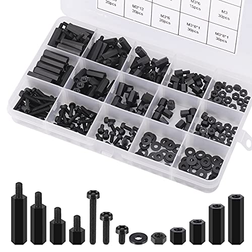 Zocipro 300Pcs M3 Nero Kit di Distanziatori Assortiti Maschio Femmina Nylon Distanziatori Esagonali, Distanziale Vite Kit di Assortimento di Dadi PCB Leggero e robusto con Scatola di Plastica