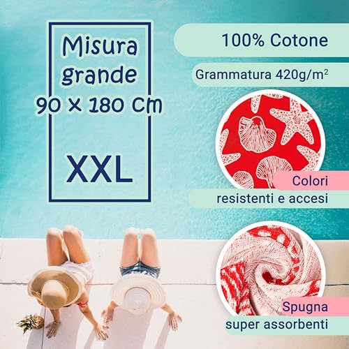 DIMENSIONE IDEALE - Con una dimensione di 90x180 cm, il telo in spugna resistente è perfetto come telo da spiaggia, tappetino per il lettino, coperta per la piscina o semplicemente per accoccolarsi con i bambini dopo una nuotata.