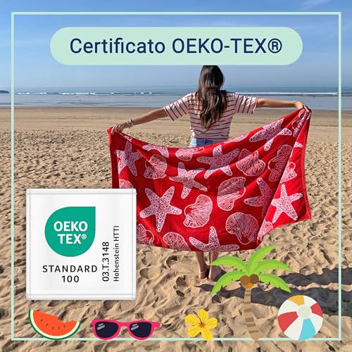 ZOLLNER Telo mare - asciugamano da spiaggia morbido e assorbente in 90x180 cm - lavabile a 60°C - cotone - Rosso - design marittimo con stelle e conchiglie - certificato OEKO TEX (R)