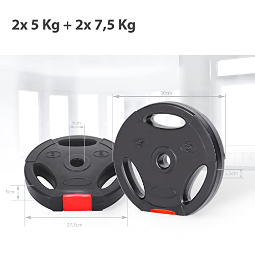 Ogni disco è dotato di tre impugnature per dita per essere maneggiato con facilità e può essere usato quindi anche per esercizi liberi. Il set di dischi comprende 2 x 5 kg e 2 x 7,5 kg