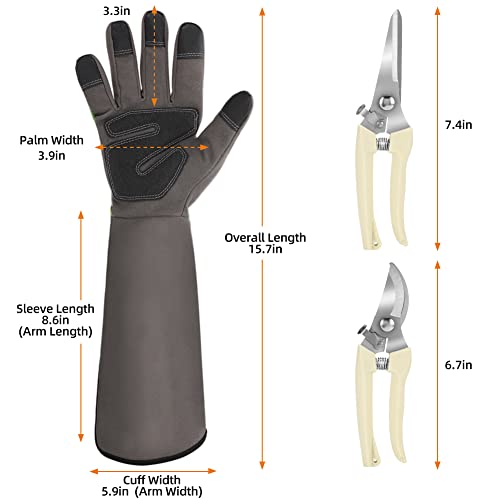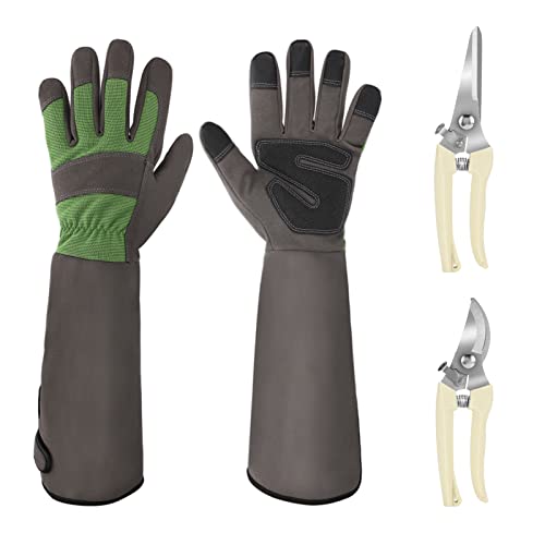 【Strumento da giardinaggio perfetto】 - Riceverai un paio di guanti da giardinaggio lunghi e 2 pezzi di forbici per rami in acciaio inossidabile. Sono il partner perfetto per gestire tutte le tue attività di giardinaggio durante la potatura, il diserbo, la semina, lo scavo, la raccolta dei frutti e altro ancora. Un must in quattro stagioni per tutti i giardinieri, paesaggisti, lavoratori, agricoltori e altro ancora.