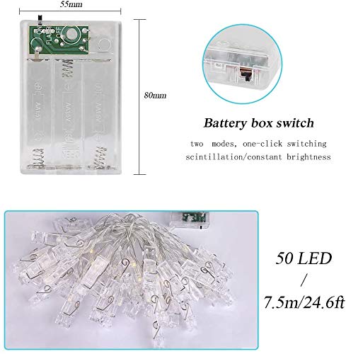 Zorara Stringa di luce a LED con batteria con clip per foto, immagini con clip per catena, decorazione per cornice della stanza 7.5M Bianco caldo