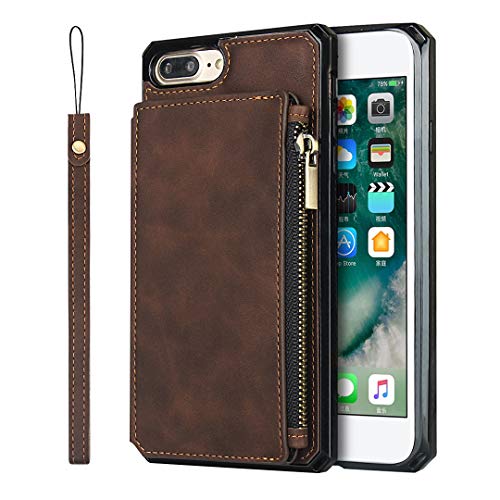Zouzt [RFID Blocking] Portamonete per iPhone 7 Plus Custodia a portafoglio con cinturino da polso per porta carte Custodia in pelle PU premium, cover posteriore For iphone 8 Plus Marrone scuro