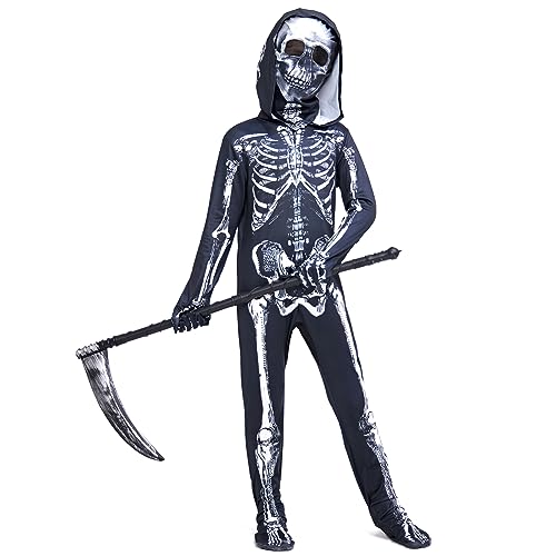 ZUCOS Tuta intera da scheletro 3D, per bambini, unisex, con ossa, costume di Halloween, integrale con maschera e falce, nero, taglia 4-6 anni