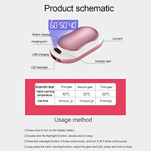 Grande capacità: lo scaldamani USB ha una grande capacità di 10000 mAh, tempo di riscaldamento continuo fino a 18 ore, bassa temperatura (40 °C) può essere utilizzato per 18 ore, temperatura costante (50 °C) può essere utilizzato per 8 ore e ad alta temperatura (60 °C) può essere utilizzato per 7 ore. Tenere al caldo all'aperto.