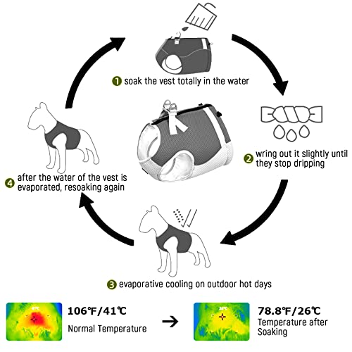 Come usare - Immergi il giubbotto nell'acqua fredda fino a quando non è completamente bagnato, strizza l'acqua in eccesso, metti il giubbotto rinfrescante sul tuo amico peloso. Se viene evaporata troppa acqua durante l'uso all'aperto, può essere riutilizzato ripetendo il processo di ammollo.