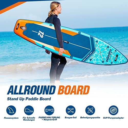 Cintura e zaino: con la tracolla in tre parti e il manico al centro della tavola, la tavola può essere indossata per brevi distanze dopo l'uso. Inoltre, il robusto zaino offre la possibilità di riporre e trasportare in modo sicuro la tavola da SUP piegata, la pompa ad alta pressione, la pagaia e il kit di riparazione.