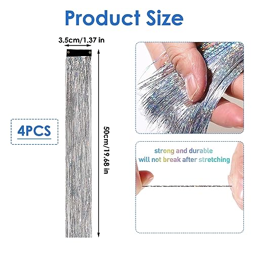 Zuroki Fili per Trecce Capelli, Tinsel Hair Extension, 4 Pcs Ciocche da Agganciare, 50 cm, Accessori per Capelli a Effetto Glitter (Argento)