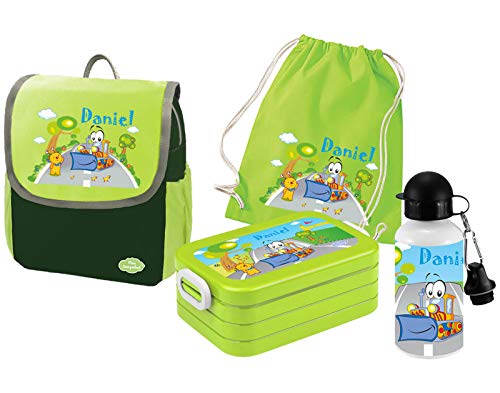 Mein Zwergenland Set 2 Zaino per L' Asilo e Sacca di Cotone Happy Knirps Prossimo con Nome Verde - ESCAVATORE, SET 2: Rucksack, Turnbeutel