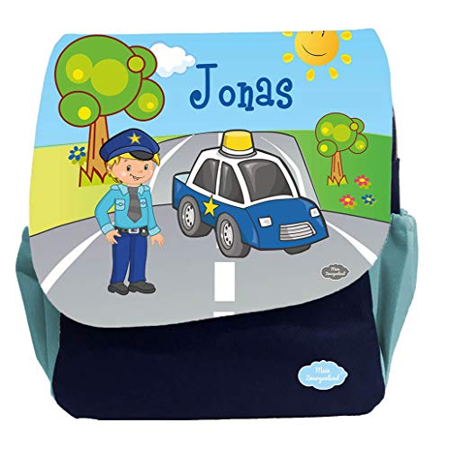 Mein Zwergenland Set 4 Zaino per L' Asilo con Scatola Pranzo Maxi e Palestra Cotone Happy Knirps Prossimo Stampa con Nome Blu - Polizia, Rucksack einzeln