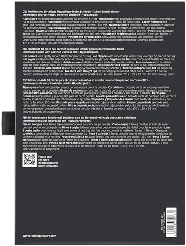 Contenuto del 1 tagliaunghie, 1 pinza per unghie, 1 pinza per pelle, 1 forbici per unghie, 1 forbici per pelle, 1 pinzetta inclinata, 1 pinzetta a punta, 1 pinzetta dritta, 1 lima per unghie, 1 strumento doppio