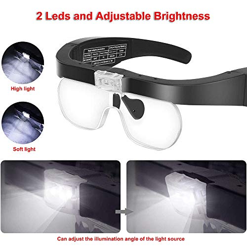 2 luci a LED e 2 luminosità: lente d'ingrandimento montata sulla testa con 2 luci a led, il pulsante sul telaio destro può cambiare la luce a led, ci sono 2 tipi di luminosità (alta luminosità e luminosità morbida) regolazione e l'angolo di illuminazione della sorgente luminosa. La luminosità della lampada a LED può essere regolata. Basta spostare il guscio protettivo in plastica trasparente della lampada a led per regolarlo secondo necessità. La luce è luminosa e non danneggia gli occhi.