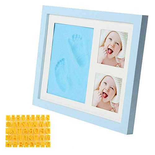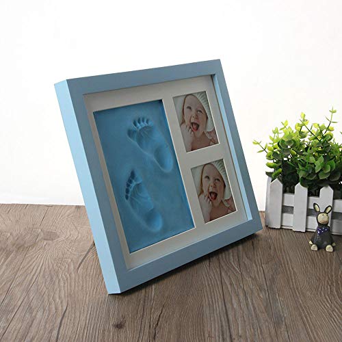 ZYEZI Cornice per foto commemorativa con scritta "Baby Handfoot" (con stencil per fango e impronte), bellissimo regalo per neonati, decorazioni memorabili per la casa, blu