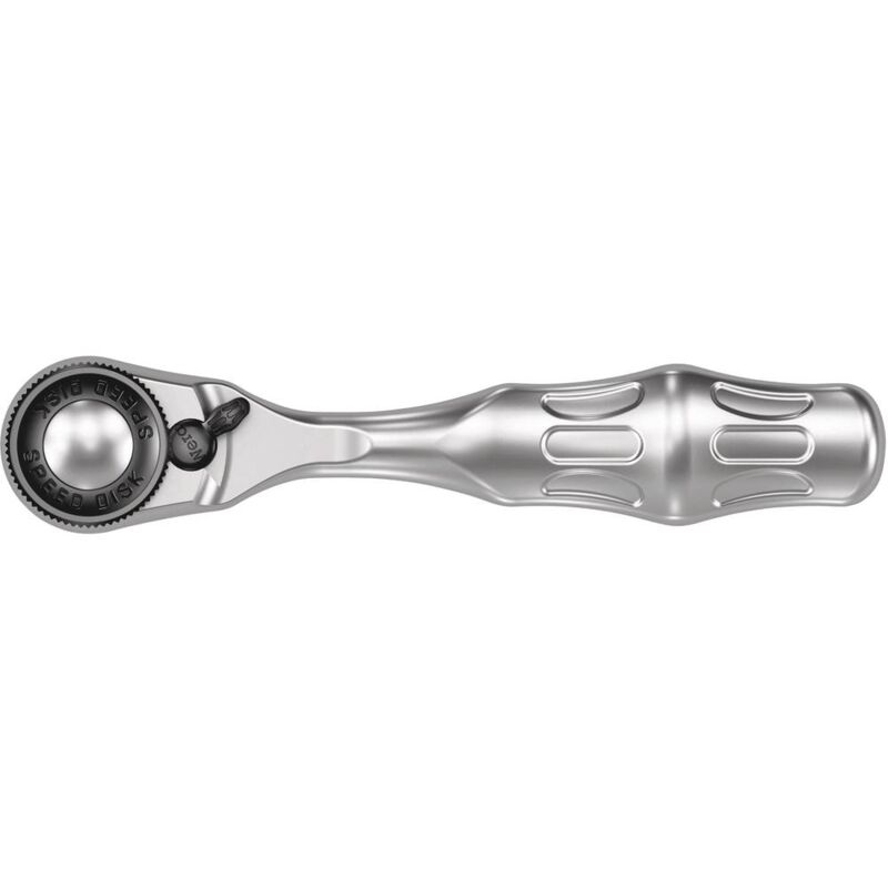 Dettagli tecnici Dimensione del prodotto, larghezza 50 mm Dimensione del prodotto, lunghezza 100 mm Dimensioni (L x L x A) 100 x 50 x 27 mm Dimensioni prodotto Altezza 27 mm Numero di denti 60 Peso 66 g Tipo prodotto Cricchetto con levetta d'inversione 8008 A Zyklop Mini 3 Cricchetto con azionamento da 1/4 Il cricchetto Wera Zyklop Mini 3 per dadi da 1/4. Funzionamento semplice anche con una sola mano in caso di applicazioni a vite limitate. Realizzazione completamente in acciaio forgiato. Il meccanismo a dentatura fine con 60 denti consente un angolo di ritorno ridotto di 6° per lavori precisi. La ruota zigrinata consente una rapida avvitamento in situazioni ristrette, quando non c'è spazio per il cricchetto. Semplice commutazione a sinistra/a destra. Testa e leva del nottolino sagomate ergonomiche. Applicazione: Per inserti per chiavi a bussola quadrate da 1/4 e parti di collegamento da 1/4 con attacco quadrato, con bloccaggio a sfera. Modello: In acciaio pieno forgiato, meccanismo